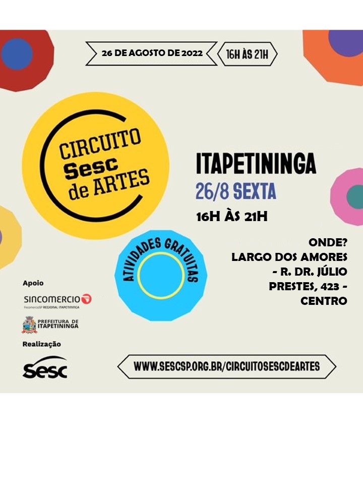 Itapetininga recebe no dia 26 de agosto, o Circuito Sesc de Artes, no Largo dos Amores, das 16 às 21 horas. O evento é promovido pelo SESC SP em parceria SINCOMERCIO ITAPETININGA e PREFEITURA MUNICIPAL.
