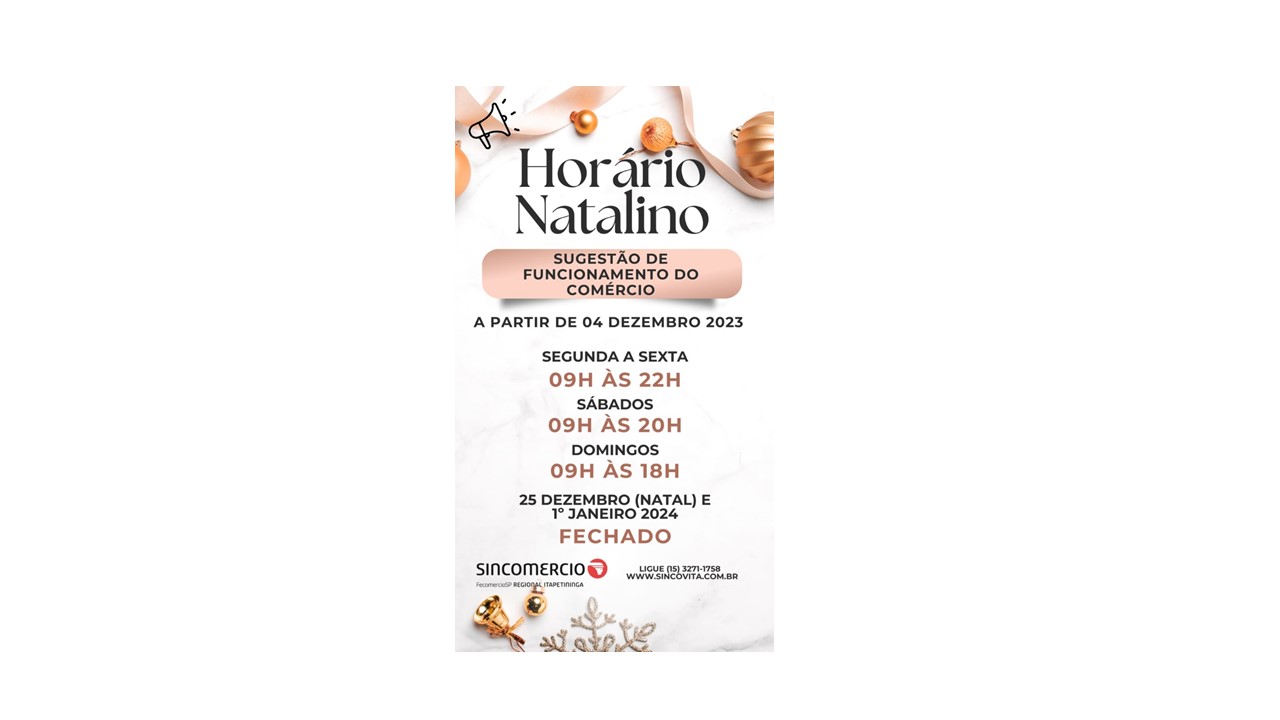 30 de novembro de 2023SUGESTÃO DE FUNCIONAMENTO DO COMÉRCIO DE ITAPETININGA DEZEMBRO DE 2023 – HORÁRIO NATALINO